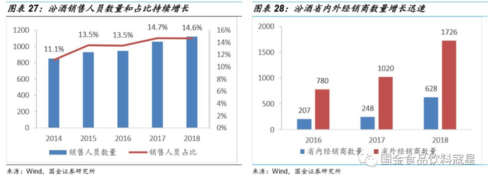 汾酒复兴亟需深化全国化布局。公司要想实现规模化成长必须依靠全国化。虽然汾酒在山西市场拥有主导地位,在市场调整阶段依然有绝对的市场占有率和销量,山西省的经济增长、行业景气度持续和消费升级更是为省内的白酒需求增长带来了强劲动力,高端白酒价格上涨进一步促进次高端快速扩容;但山西的消费水平总体仍低于我国东南部经济发达地区,人口总量也较为有限,因此省外市场的开拓和全国化布局对于汾酒的复兴而言尤为重要。汾酒在山西省内采用直分销模式,省外采用N+1模式,以经销商渠道及其发展的各类终端如酒店、商超等为主要渠道。全国市场销售人员数量2018年达到1121人,占员工总数15%左右,经销商规模2019Q3末达到2432家,终端数量2018年底达到30万家。其中,省外市场的销售人员、经销商、渠道终端自2017年以来持续大幅增长,经销商规模从2016年的207个增长到2018年的1726个,团购与终端零售同步发展。