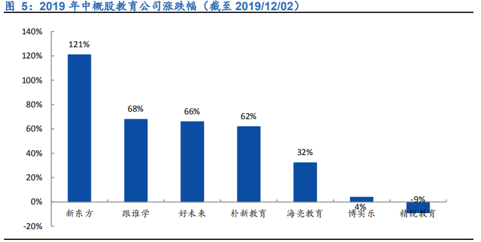 2019年港股的思考乐教育和天立教育都有翻倍涨幅。总体来看,港股上市公司以学历教育为主,包括 K12 学历教育(枫叶教育、睿见教育等)和高等学历教育(中教控股、民生教育等);此外,还有职业技能教育龙头中国东方教育,K12 课外辅导新东方在线、思考乐教育。教育行业的细分行业随着发展,越来越多并且分工具体。