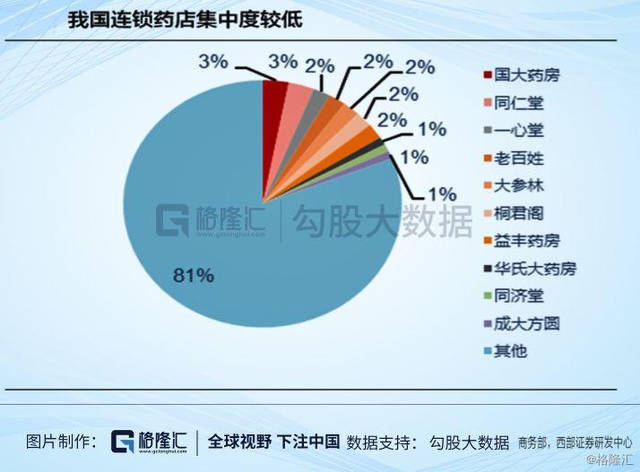1.行业集中。目前我国TOP10连锁药店占比不到15%: