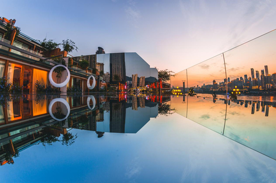 重庆的天空之镜,一个是江北,另一个,便是在南滨路上的浅憩In酒店。江北银行门前的一个小水池,犹如镜子一般,将来福士广场、国泰大戏院、千厮门大桥、WFC写字楼等渝中半岛的知名建筑倒映在水中,高楼大厦鳞次栉比,白天景城一色,夜晚流光溢彩,被人们誉为“天空之镜”,成为网红城市的新晋打卡地。