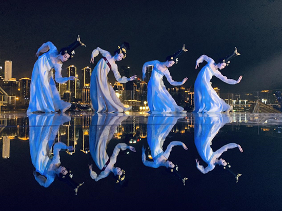 “丽人行”的首次重庆露天之舞,就是在浅憩的天空之镜上起舞。婀娜多姿的唐代女子舞动香袖,轻移步伐,以整个城市作为旋转跳跃的背景,以湛蓝天空作为曲回婉转的幕布,拍摄出张张大片。