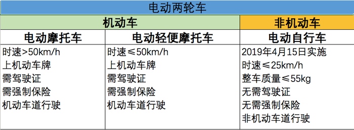 如果连带早14天实行的《电动摩托车和电动轻便摩托车通用技术条件》(下称《技术条件》)一起,那么两轮电动车可分为电动自行车、电动轻便摩托车、电动摩托车,三类车主要通过速度、重量、动力性能等指标来界定。