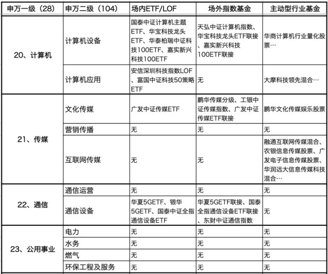 20、计算机。二级行业计算机设备对应的场内基金有国泰中证计算机主题ETF、华宝科技龙头ETF、华泰柏瑞中证科技100ETF、嘉实新兴科技100ETF,场外指数基金有天弘中证计算机指数、华宝科技龙头ETF联接、嘉实新兴科技100ETF联接,主动型行业基金有华商计算机行业量化股票;二级行业计算机应用对应的场内(外)指数基金有安信深圳科技指数LOF、富国中证科技50策略ETF,主动型行业基金有大摩科技领先混合。21、传媒。二级行业文化传媒对应的场内基金有广发中证传媒ETF,场外基金是其联接基金以及鹏华传媒分级、工银中证传媒指数,主动型行业基金有鹏华文创传媒娱乐股票;二级行业互联网传媒主动型行业基金有融通互联网传媒混合、农银信息传媒股票、广发电子信息传媒股票、华润元大信息传媒科技混合。22、通信。二级行业通信设备对应的场内基金有华夏5GETF、国泰中证全指通信设备ETF、银华5GETF,场外指数基金是前两者的联接基金以及东财中证通信指数。23、公用事业。无对应行业基金。