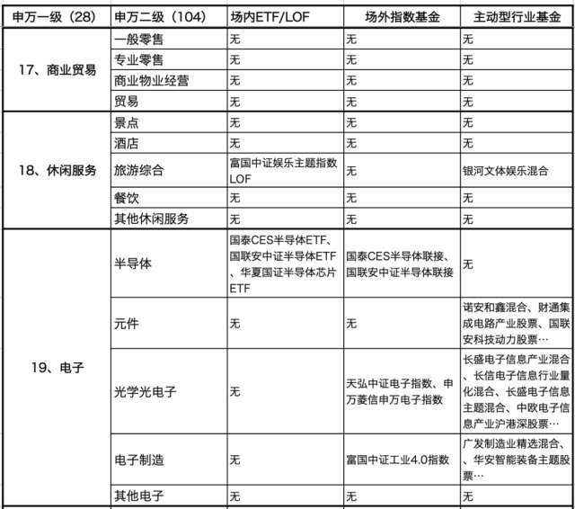 17、商业贸易。无对应行业基金。18、休闲服务。二级行业旅游综合对应的场内外指数基金有富国中证娱乐主题指数LOF,主动型行业基金有银河文体娱乐混合。19、电子。二级行业半导体对应的场内基金有国泰CES半导体ETF、国联安中证半导体ETF、华夏国证半导体芯片ETF,场外指数基金是前两只的联接基金;二级行业元件对应的主动型行业基金有诺安和鑫混合、财通集成电路产业股票、国联安科技动力股票;二级行业光学光电子场外基金有天弘中证电子指数、申万菱信申万电子指数,主动型行业基金有长盛电子信息产业混合、长信电子信息行业量化混合、长盛电子信息主题混合、中欧电子信息产业沪港深股票;二级行业电子制造对应的场外指数基金有富国中证工业4.0指数分级,主动型行业基金有广发制造业精选混合、华安智能装备主题股票。