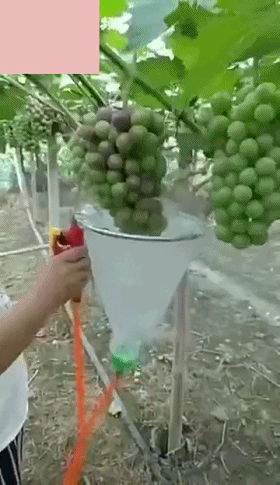 视频中,一名果农正在用一种罩子形状的喷雾器给一串串葡萄喷液体,画外音中介绍“现在是用肥料的第三天,大部分已经开始变红,然后下午用催色剂,强制转色,变成这个颜色,7到10天就可以上市了”。我们吃的葡萄有可能是被“药水”催熟的。