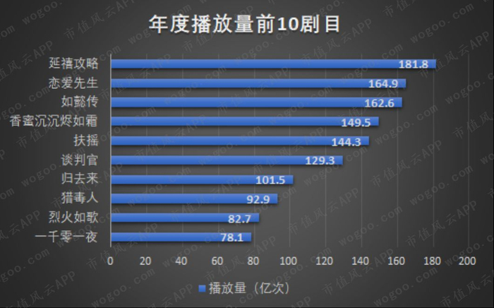 从质量上看,年度播放量前10剧目,完美影视参与制作的有3部,分别是《香蜜沉沉烬如霜》、《归去来》和《烈火如歌》。