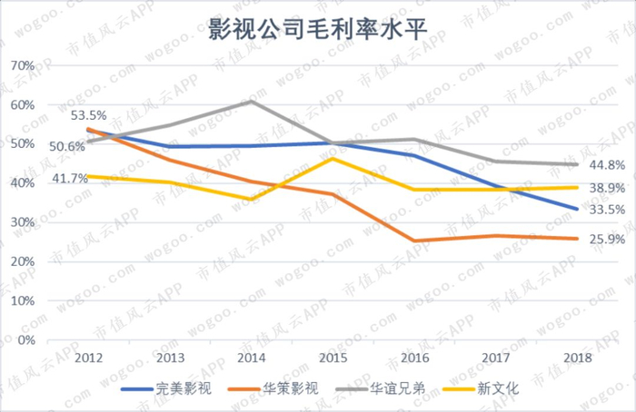近年来,影视行业的整体毛利率水平下降,2012年至2018年,华策影视的毛利率从54%降至26%,完美影视从53.5%降至33.5%。
