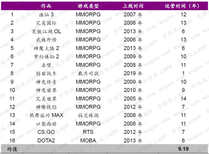 其中,公司自研的《完美世界》、《诛仙3》、《武林外传》分别运营14年、12年和13年。