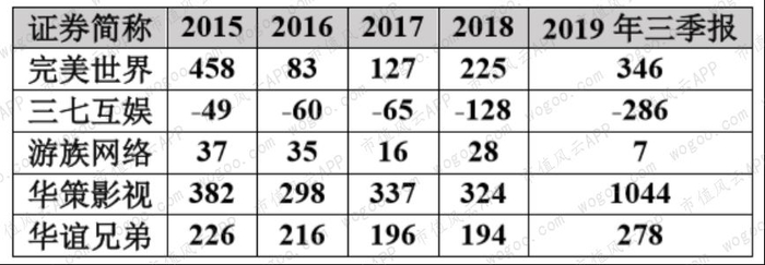 下表是完美世界与两家游戏公司、两家影视公司的现金循环周期。