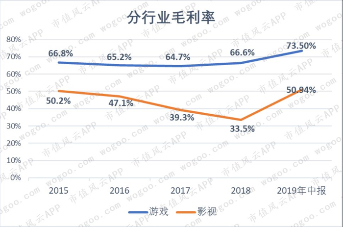 分行业看,游戏行业的毛利率稳定在64.7%-67%之间,高于影视行业,影视业务毛利率呈下降趋势,2018年仅为33.5%。