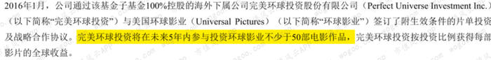 2016年1月,投资17.3亿元展开对美国环球影业的片单投资和5年期战略合作,约定未来5年内参与环球影业不少于50部作品。