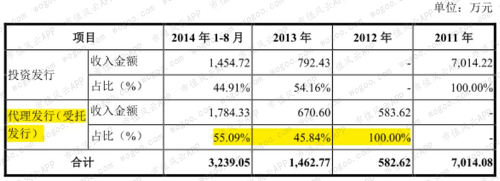 2011年-2014年8月,受托发行的项目(代理发行的一种)即不参与其投资摄制过程,2014年1-8月的营收占比高于投资发行。