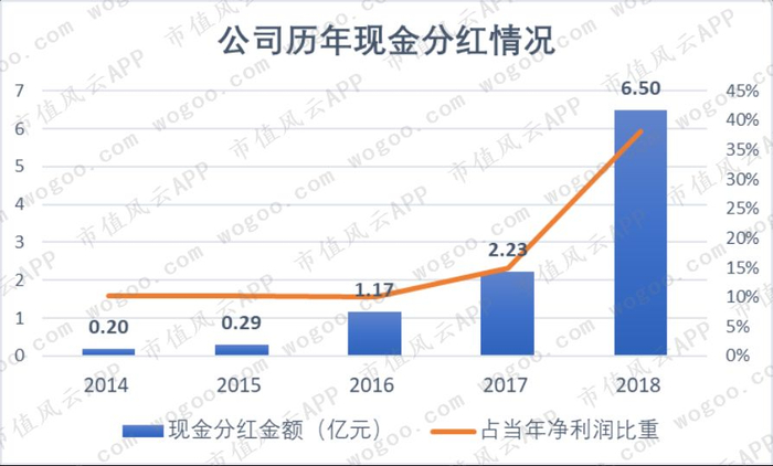 公司年年有分红,2017和2018年占净利润比重显著增长,2018年现金分红达6.5亿元,占净利润比重38.1%。