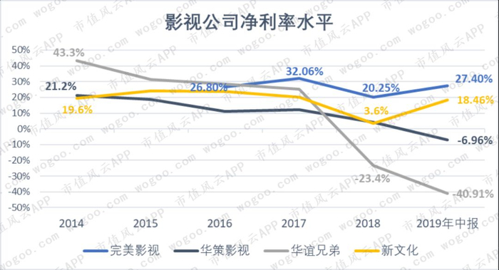 单纯以完美影视与其他公司对比,其净利率高于华策影视、华谊兄弟和新文化。