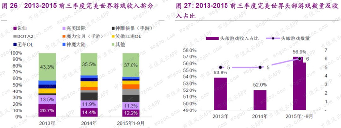 以2015年1-9月为例,《诛仙》、《完美国际》、《DOTA2》等6款游戏收入合计15.3亿元,占总收入56.9%。