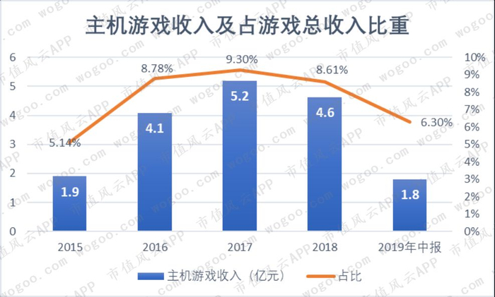 主机游戏的收入绝对值以及占公司游戏业务份额均呈先增后降的趋势。