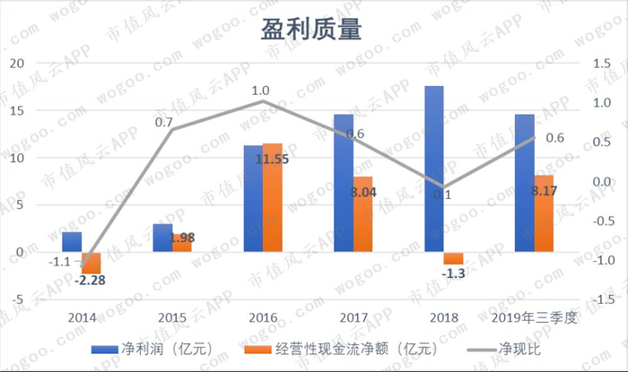 2014-2019年三季度,公司累计实现净利润63.3亿元,但经营性现金净流入仅26.2亿,其中2014和2018年经营性现金流呈净流出。