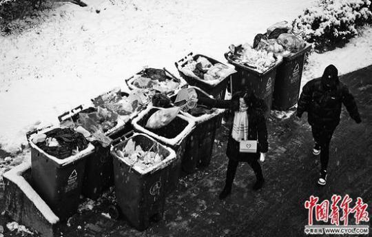 12月16日,北京朝阳区一小区内,住户将垃圾袋投放到路边的垃圾桶。中青报⋅中青网见习记者 张玉佳/摄