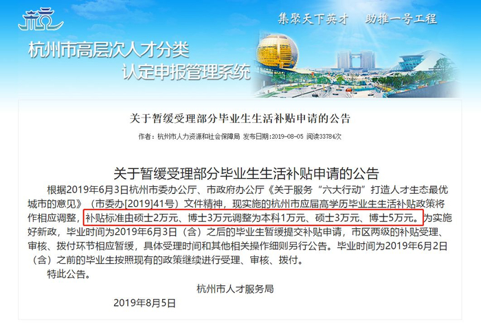 今年8月,浙江杭州人才政策再度升级,本科毕业生被首次纳入补贴范围。杭州市人才服务局发布的相关公告显示,现实施的杭州市应届高学历毕业生生活补贴政策将作相应调整,补贴标准由硕士2万元、博士3万元,调整为本科1万元、硕士3万元、博士5万元。