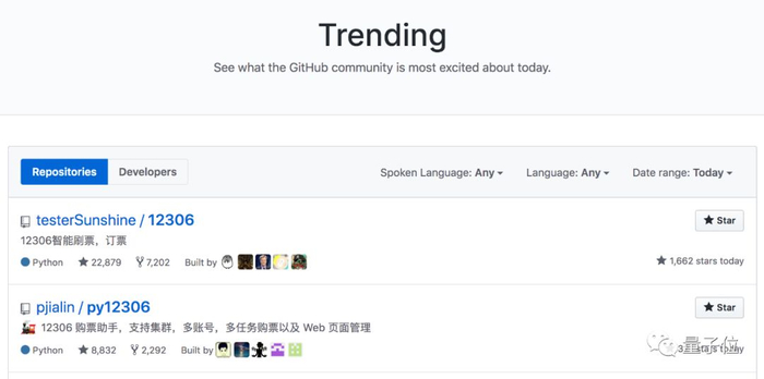 排在GitHub热榜第1的项目名字简单粗暴,就直接叫12306,已经有21300星,来自ID为testerSunshine的作者。