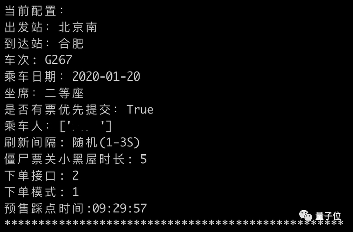 5、乘车人填入你12306账号中常用联系人的姓名,比如TICKET_PEOPLES = [“张三”],如果没有,需要登录12306手动添加;