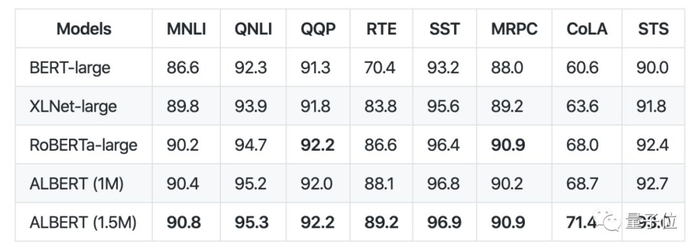 Albert使用了一个单模型设置,在 GLUE 基准测试中的性能: