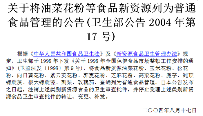 此外,蜂花粉只是一种普通食品。在2004年,原国家卫生部就将松花粉、油菜花粉等移出“新资源食品和保健食品”的名单,纳入“普通食品”管理。