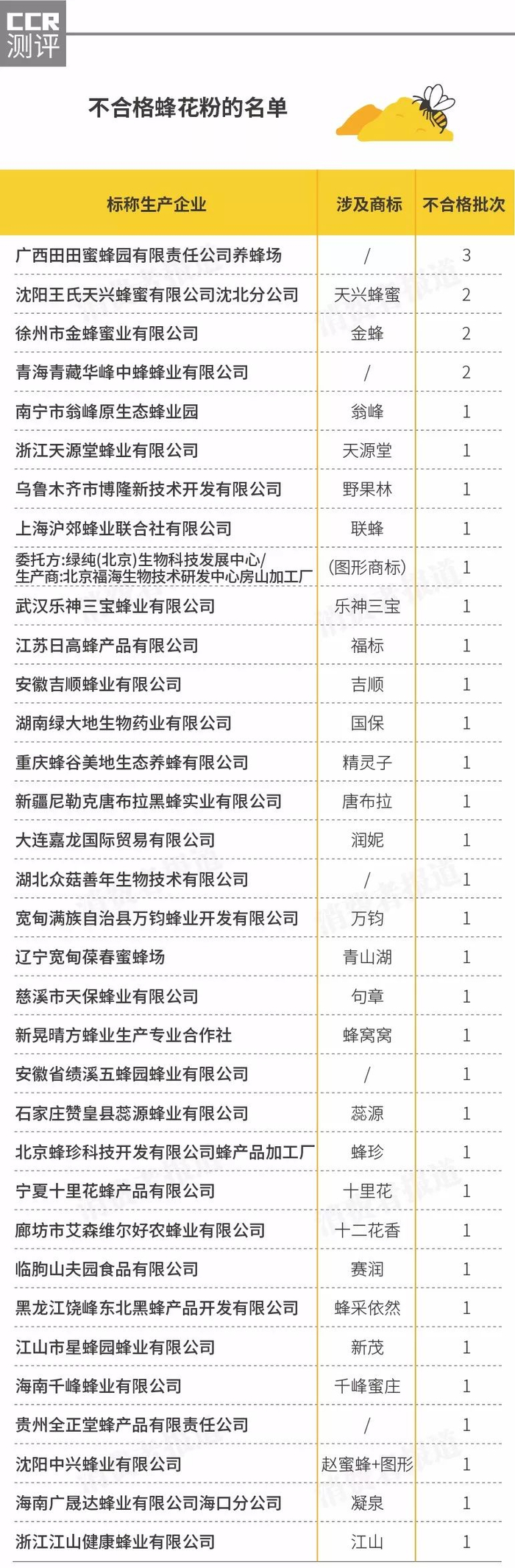 从品牌上看,此次抽检中发现的不合格蜂花粉涉及蜂珍、金蜂、天源堂、蜂采依然、江山等商标。