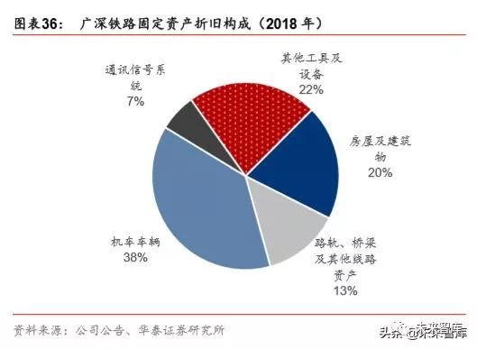 京沪高铁折旧主要来自:线路(75%)、房屋及建筑物(14%)、供电和信号设备(6%) (2018 年)。由于动车组产权不在公司,京沪高铁不计提动车组折旧,而是每年支付动车组使用 费,相当于长期的融资租赁。我们将京沪高铁的折旧与动车组使用费视为整体,绘制各项 目的构成比例。横向比较观察,广深铁路和大秦铁路建造时间较早,线路折旧费用的占比 较低,车辆折旧费用占比较高。