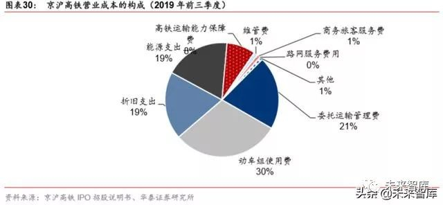 京沪高铁的营业成本主要包括:委托运输管理费(21%)、动车组使用费(30%)、折旧支 出(19%)、能源(19%)、高铁运输能力保障费(8%) (2019 年前三季度)。其中,属于 关联交易定价的主要项目包括委托运输管理费、动车组使用费、高铁运输能力保障费,三 者合计占总成本的 59%。委托运输管理费属于公司与铁路局协商定价,动车组使用费和高 铁运输能力保障费属于国铁集团制定的全路统一的清算定价。