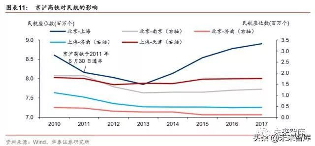 京沪高铁对许多航线产生过重大影响。京沪高铁沿线的重要空港枢纽为北京、天津、济南、 南京、上海,重要航线为北京-上海、北京-南京、北京-济南、上海-济南、上海-天津。受 京沪高铁 2011 年 6 月 30 日通车的影响,上述 5 条航线的座位数在 2011-2013 年显著降 低。从 2014 年起,长距离航线恢复自然增长,如北京-上海(1075 公里)、上海-天津(951 公里)、北京-南京(948 公里);但短距离航线持续萎缩,如北京-济南(362 公里);中等 距离航线上海-济南(734 公里)则保持平稳。