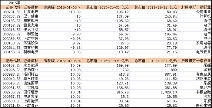 2015年1月5日,开市首日延续了2014年下半年的行情,近百只个股收盘录得涨停,跌停的个股仅有10只不到。其中,前12只涨停个股中半成来自采掘行业,包括永泰能源(600157.SH)、陕西煤业(601225.SH)、山煤国际(600546.SH)、上海能源(600508.SH)、大同煤业(601001.SH)、阳泉煤业(600348.SH)。