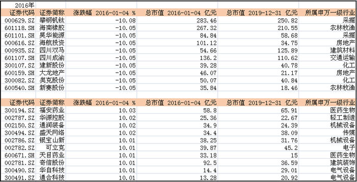 而2016年两市第一个交易日的表现似乎也成为了全年市场表现的缩影。2016年1月4日,两市共计超1600只个股以跌停收盘,其中海南橡胶(601118.SH)、昊华能源(601101.SH)、海航投资(000616.SZ)等领跌。相比之下,涨停的个股只有30只。