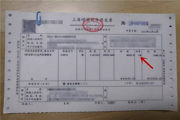 我们在购车时,经销商通常会给我们开具“增值税专用发票”,其中就包含了增值税税额。以一台开票价10万元的新车为例,增值税税率13%,增值税税额11504.42元。