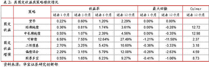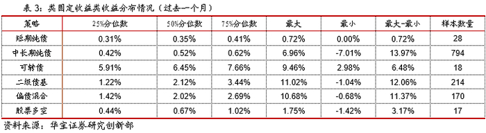 对于固定收益策略,过去一个月来看,货币、短期纯债以及中长期纯债分别录得收益率0.22%、0.36%、0.55%,从样本基金分布来看,短期纯债收益中位数为0.35%,区间范围为0.00%到0.72%,中长期纯债收益中位数为0.52%,区间范围为-7.01%到6.96%,中长期纯债基金收益差距较大,短期纯债表现相对平均,总体中长期纯债平均收益好于短期纯债和货币基金。从过去一年来看,中长期纯债表现相对占优,但短期纯债回撤更小,收益风险比二者相似。