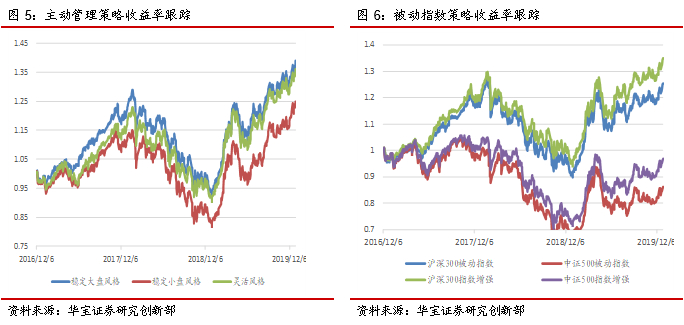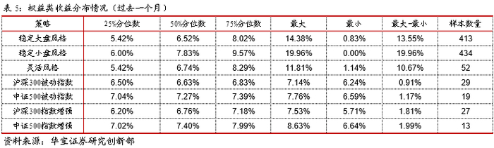 对于主动管理策略,过去一个月来看,稳定大盘风格、稳定小盘风格以及灵活风格分别录得收益率6.73%、7.89%、6.88%,从样本基金分布来看,稳定大盘风格基金收益中位数为6.52%,区间范围为0.83%到14.38%,稳定小盘风格基金收益中位数为7.83%,区间范围为0.00%到19.96%,灵活风格基金收益中位数为6.74%,区间范围为1.14%到11.81%,从主动管理型基金不同风格收益情况来看,差距不明显,稳定小盘风格基金虽然收益较高,但回撤也更大,整体来看2019年稳定大盘风格基金收益风险比更高。
