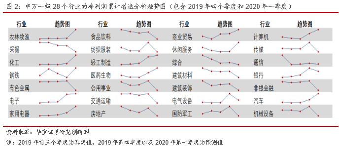 从预测结果来看,大部分行业在2019年四季度净利润增速较三季度显著回升,但是采掘、钢铁行业的2019年第四季度净利润增速却较前三季度明显回落。结合2020年一季度净利润增速,很多行业在2019年四季度和2020年一季度净利润增速都维持上升态势,其中农林牧渔、电子、计算机、家用电器板块前期净利润增速稳定,且预测增速也稳步提升;化工、汽车行业虽然在2019年净利润增速为负,但预期未来有较快增长;此外2019年第四季度表现较差的钢铁行业,2020年一季度同比亏损有所收窄。此外,食品饮料、建筑行业净利润增速出现了下滑趋势,需要警惕。