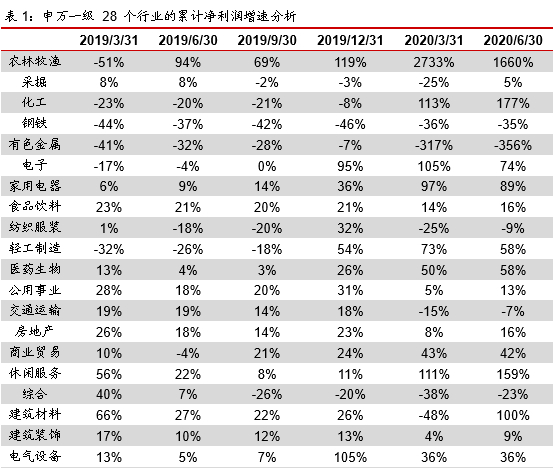将上述方法用于申万一级28个行业。对比上期单季度净利润增速的预测结果,如表1所示,各行业的累计净利润增速波动较为平缓,几乎未出现相邻季度净利润增速反复剧烈波动的情况。