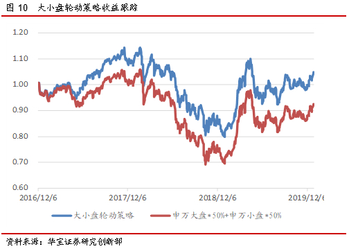 基于基本面和技术面构建多维度打分体系判定市场大小盘风格情况,经济运行方面包括CPI、M1-M2、国债期限利差以及PMI新订单,成分股景气度指标包括净利润增速、收入增速以及ROE增速,技术面指标包括波动率以及动量趋势。其中模型打分采用10分制,分数越接近10分模型偏向大盘风格,反之接近0分偏向小盘风格。根据打分体系构建大小盘轮动策略,采用申万大盘指数作为大盘代表,申万小盘指数作为小盘代表。