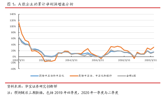 按照上述方法进行A股整体企业的累计净利润增速分析(采用整体法)。如下图所示,2019年四季度达到了18%,2020年一季度净利润增速11%,二季度15%。考虑到中石油、中石化以及银行业在整体A股的合计净利润中占比非常大。因此我们分别测试了剔除中石油、中石化以及剔除中石油中石化和银行业两种情况下的A股市场企业净利润增速情况。从预测结果来看,同时剔除中石油中石化以及银行业的情况下,2019年四季度的净利润增速预测更高,但三种情况下趋势一致,2019年四季度净利润增速都将提升,2020年一季度有所下滑后二季度持续回升。