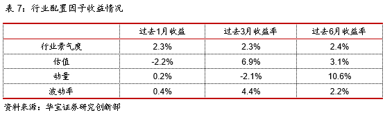 我们主要跟踪4类因子,行业景气度因子、估值因子、动量因子与波动率因子。长期来看,行业景气度因子与动量因子为正向因子,即行业景气度越高或动量趋势越强,下期该行业表现优异的概率越高;而估值因子与波动率因子为反向指标,即估值所处分位数越低或波动率越小,下期该行业表现优异的概率越高。从我们跟踪的结果来看,过去一个月估值因子表现较差,行业景气度因子较强,其余因子均录得正收益。今年以来,动量因子表现最为突出,低波因子近期有所回归,但估值因子表现不佳。