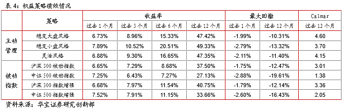 总体来看,12月权益市场大幅上涨,权益仓位配置较高的主动管理型和被动指数策略收益显著高于固定收益类策略。从细分策略来看,固定收益策略中,中长期纯债收益更高;固定收益增强策略中,股票多空策略表现最佳;权益类策略中,主动管理型基金的涨幅与被动指数型基金基本持平,同时稳定小盘风格收益表现突出。