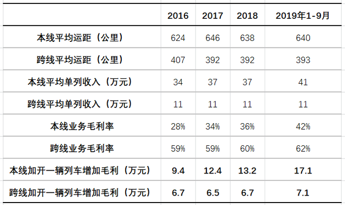 以2018年为例,平均每列本线列车贡献毛利13.2万元,而平均每列跨线列车仅贡献毛利6.7万元。