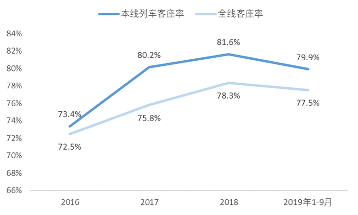 ▼ 京沪高铁本线客座率与全线客座率