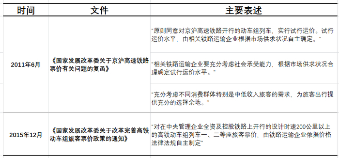2011年,发改委在《关于京沪高速铁路票价有关问题复函》中提出,原则上同意京沪高铁运价水平由相关铁路运输企业根据市场供求状况自主确定。