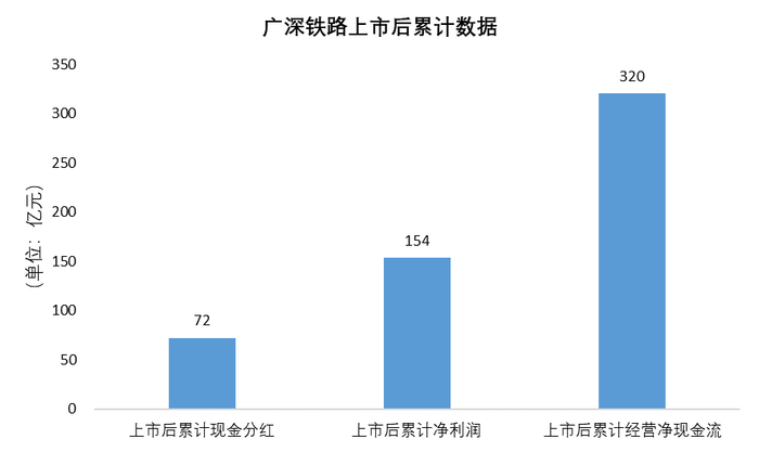 广深铁路选择的是用分红回馈股东。2006-2018年,广深铁路上市后累计净利润154亿元,累计经营净现金流320亿元,累计现金分红72亿元,分红比例高于大部分A股公司。