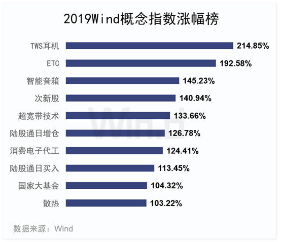 概念类指数涨幅靠前的分别为TWS耳机指数,ETC指数和智能音箱指数。其中TWS耳机指数更是在2019年度涨幅高达214.85%,ETC指数涨幅为192.58%, 智能音箱指数为145.23%。