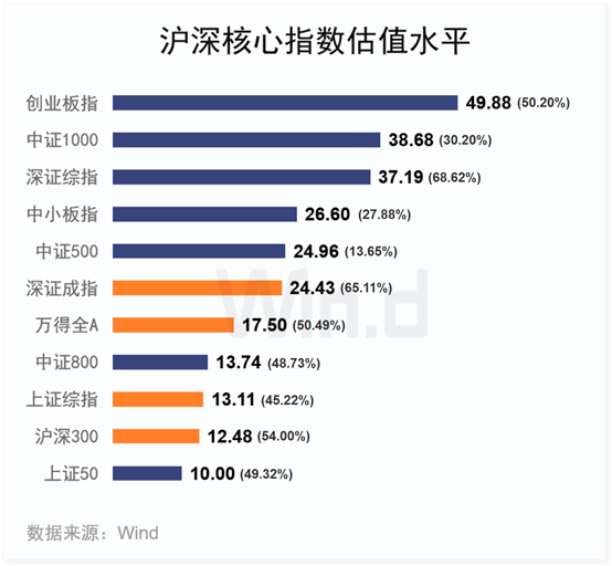 进一步来看,根据Wind统计,在19只沪深市场核心指数中,深证100、创业蓝筹、创业板50涨幅都超过了惊人的50%,深市指数整体涨幅居前,沪深300涨36.07%,中证500涨26.38% 。