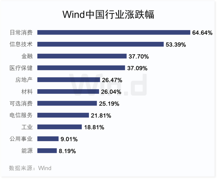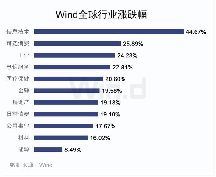 在其带动下,万得全A指数以33.02%跑赢了绝大多数行业,而涨幅垫底的为全球能源(8.49%)和材料指数(16.02%),国内也为能源(8.19%)和公共事业指数(9.01%)。