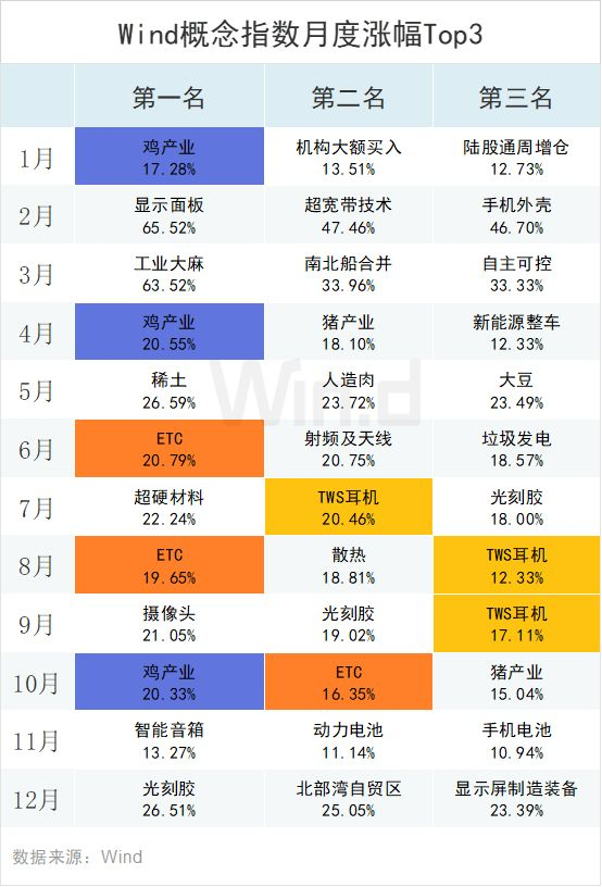 下表展示了2019年单月概念指数涨幅Top3,其中有三只概念指数再过去1年三次进入单月涨幅前三名。其中鸡产业概念分别在1月、4月和10月拿下当月涨幅第一名。而全年涨幅榜的前两名TWS耳机和ETC概念指数也分别三次进入单月Top3榜单。
